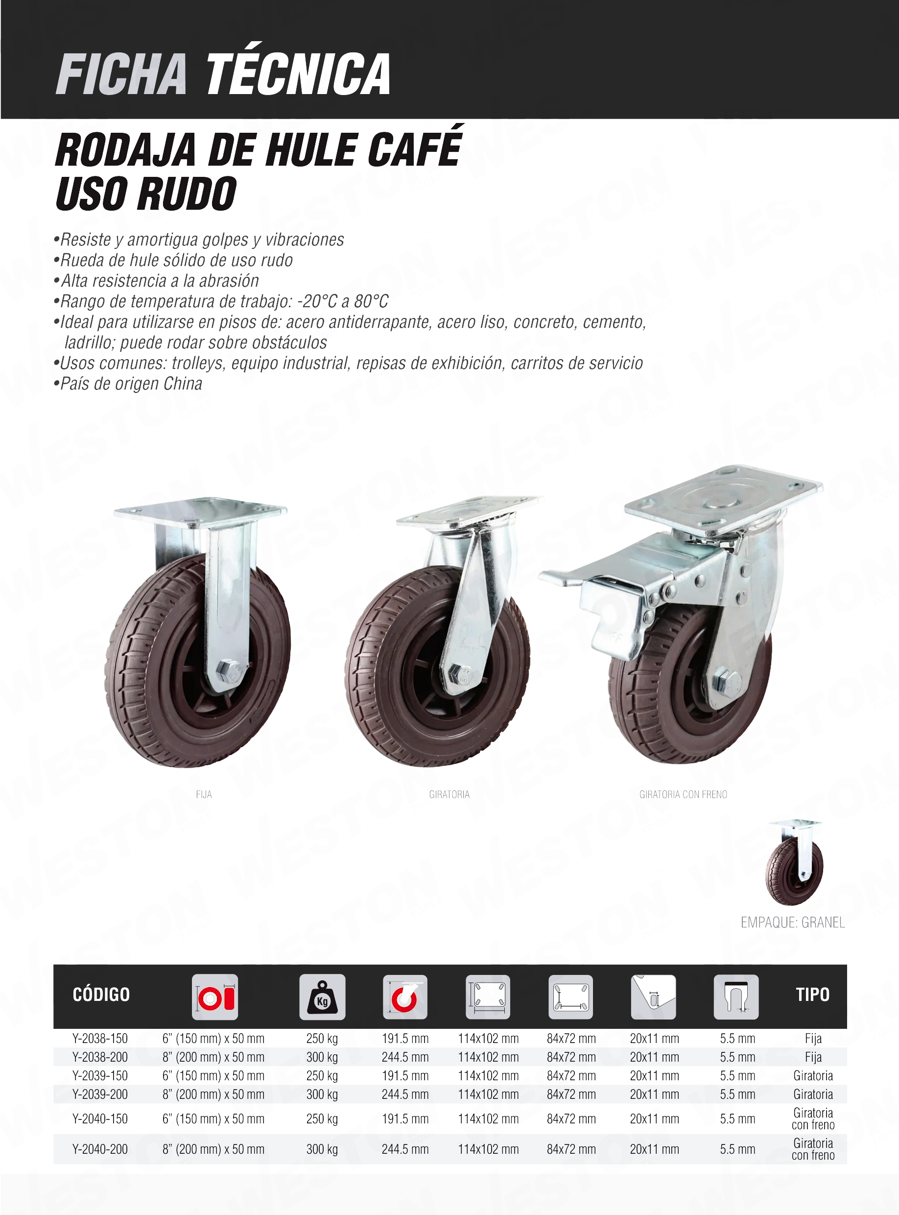 | Y-2038-150 | $346.55 + IVA | RODAJA DE HULE CAFE USO RUDO FIJA 6" (150X50MM) |